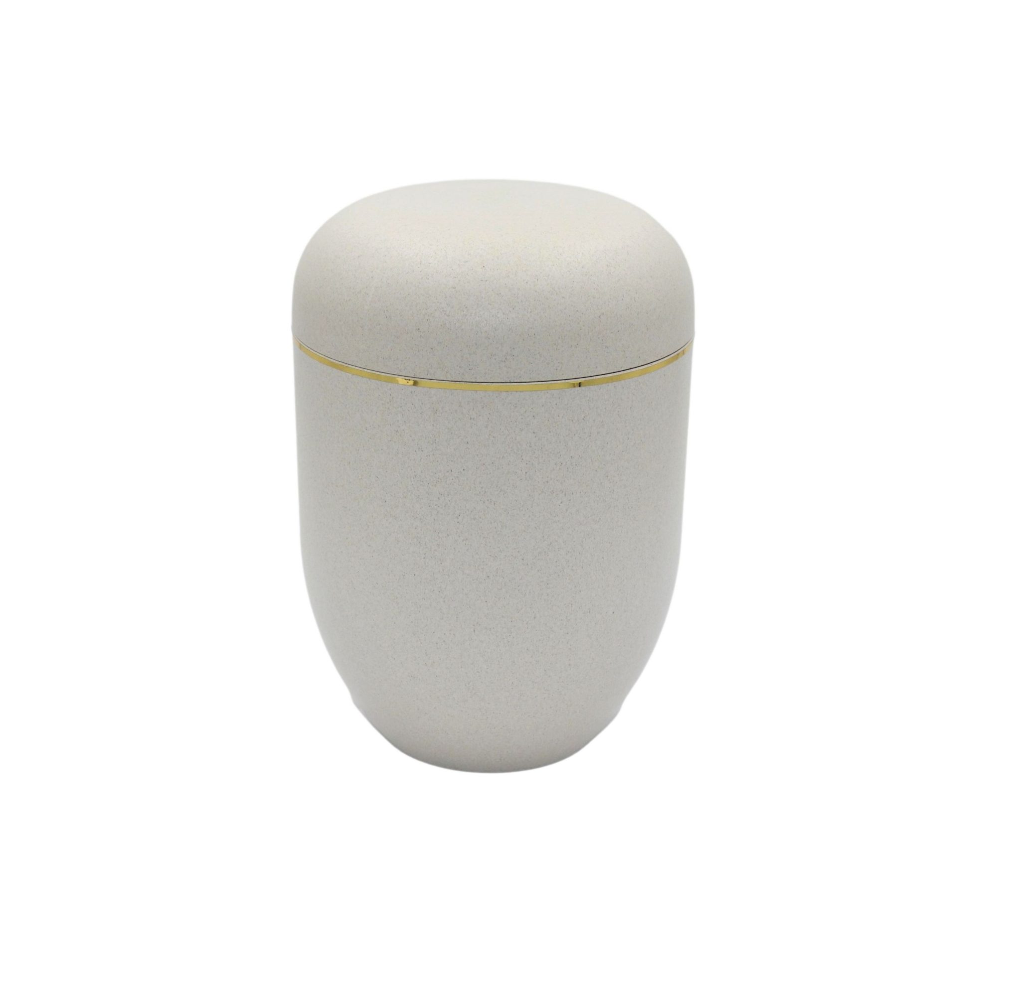 • Design und Ästhetik: Die Urne hat eine klassische, ovale (eiförmige) Gestalt in einem hellen, cremefarbenen oder hellbeigen Farbton. Sie ist am oberen Rand mit einem diskreten goldenen Band verziert, und goldfarbene Tragegriffe schmücken die Seiten.