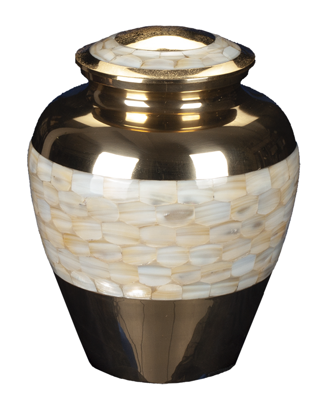 - Design-Highlight: Der zentrale Bereich der Urne ist mit einem kunstvollen Perlmutt-Mosaik verziert. Die kleinen, schimmernden Perlmutt-Stücke in sanften Pastelltönen sind sorgfältig von Hand appliziert und bilden einen wunderschönen Kontrast zu den goldenen Elementen.