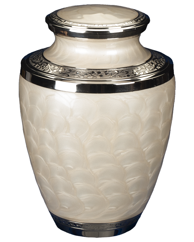 - Design-Details: Die Urne ist klassisch rund geformt und wird durch metallische Silber-Elemente an der oberen Kante und am Deckel akzentuiert. Diese silberfarbenen Bänder sind mit feinen, gravierten Mustern verziert, die einen wunderschönen Kontrast zur hellen Perlmuttoberfläche bilden. Die Kombination aus Kupfer als Basis, der pastellfarbenen Emaillierung und den silbernen Akzenten verleiht der Urne eine besonders wertige und feierliche Ausstrahlung.