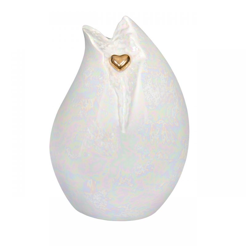 Die handgefertigte Keramikurne LIMA zeichnet sich durch ihre flügelartige, organische Form und das schimmernde Perlmutt-Finish aus. Mit einem Fassungsvermögen von 4,1 L ist sie für die Asche eines Erwachsenen geeignet (bis 120 kg Körpergewicht). Ein kleines goldenes Herz ziert die Spitze.