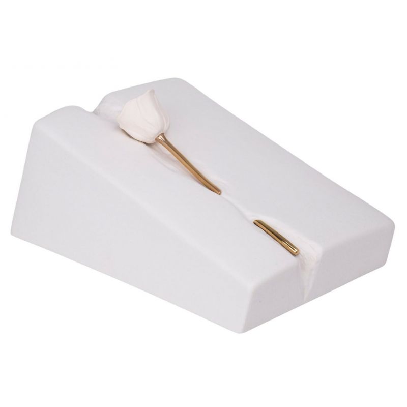 Die handgefertigte Keramikurne LILIA besticht durch ihr hochmodernes, minimalistisches Design in einem geneigten Quaderformat. Die weiße Urne wird durch eine goldfarbene, lilienförmige Verzierung akzentuiert. Mit einer Länge von 31 cm und einem Gewicht von 1,5 kg ist sie für die Asche eines Erwachsenen bis 120 kg Körpergewicht geeignet.